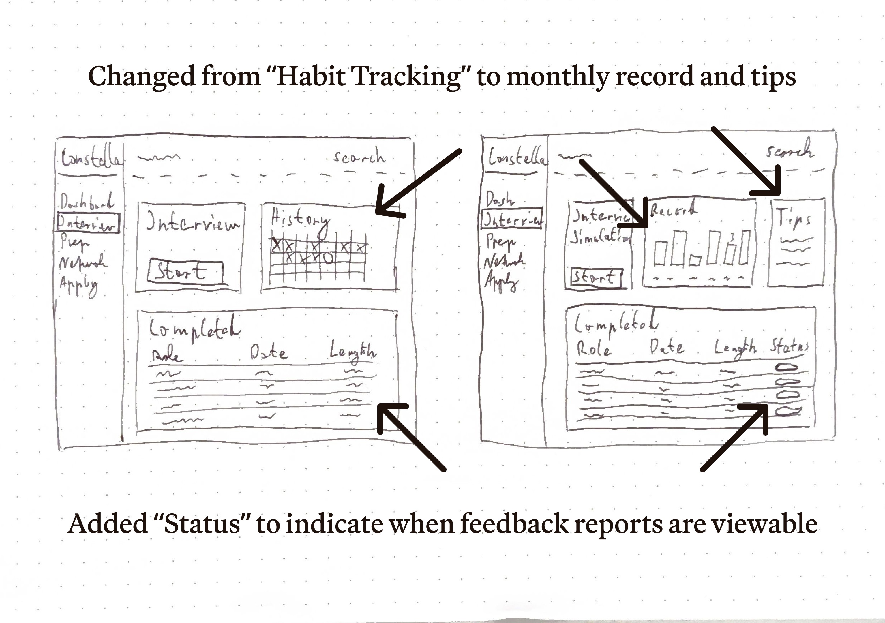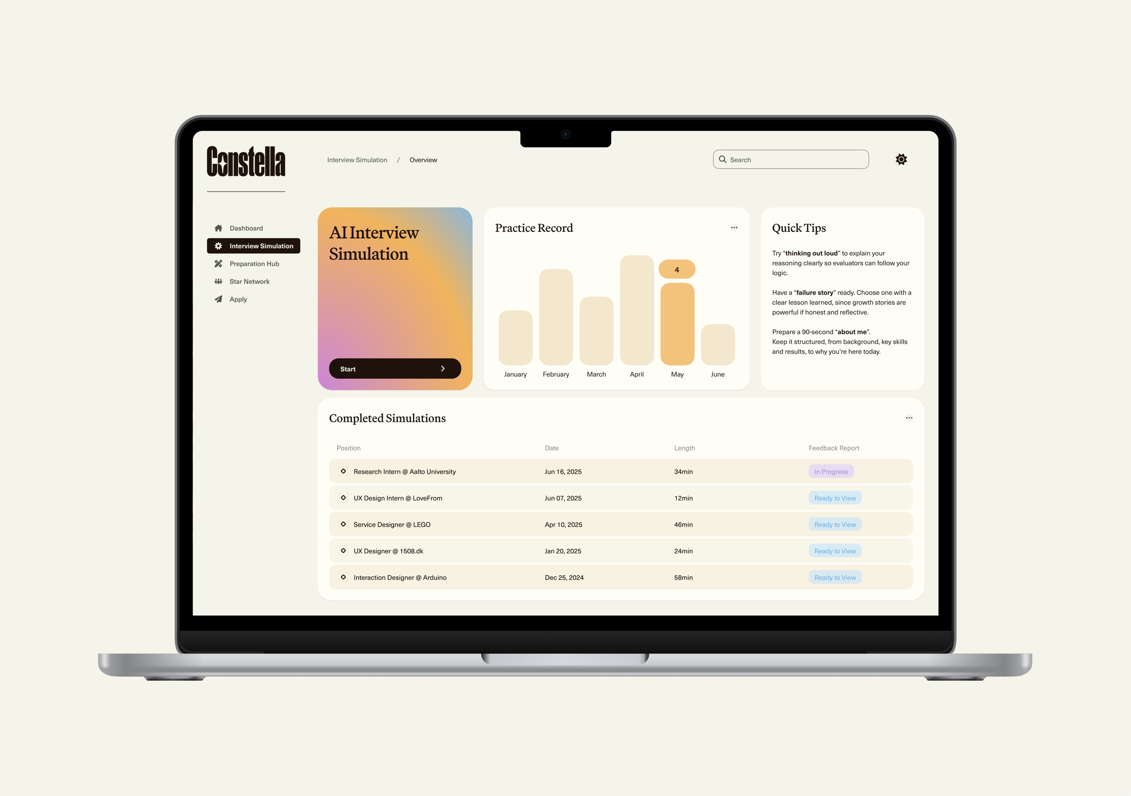 Designed a dashboard to track AI-assisted interviews, showing previously completed simulations and the candidates practice record, while offering useful quick tips personalized to each candidate.
