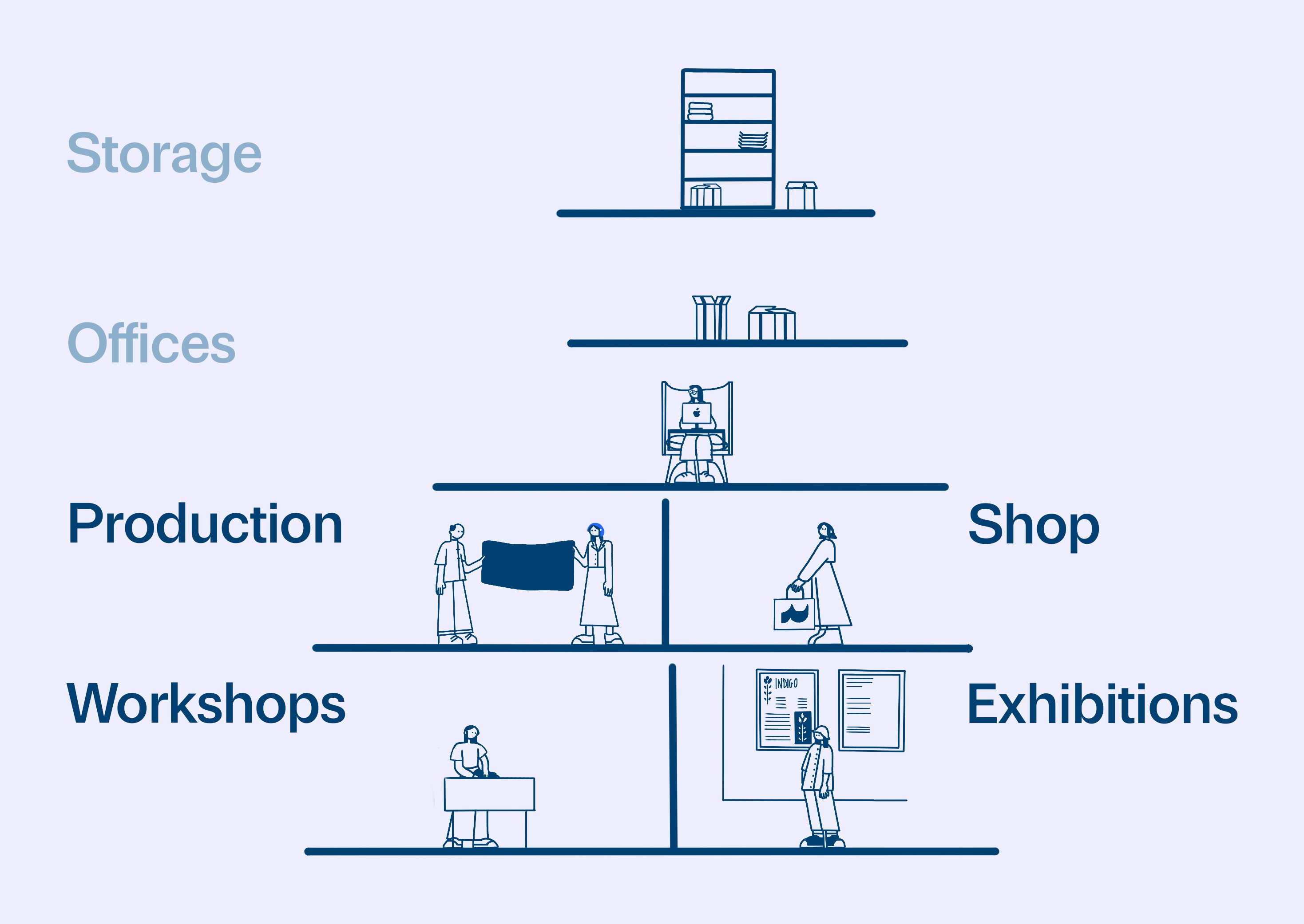 Spatial overview illustrating how workshops, production, retail, and exhibitions connect within the cultural hub.