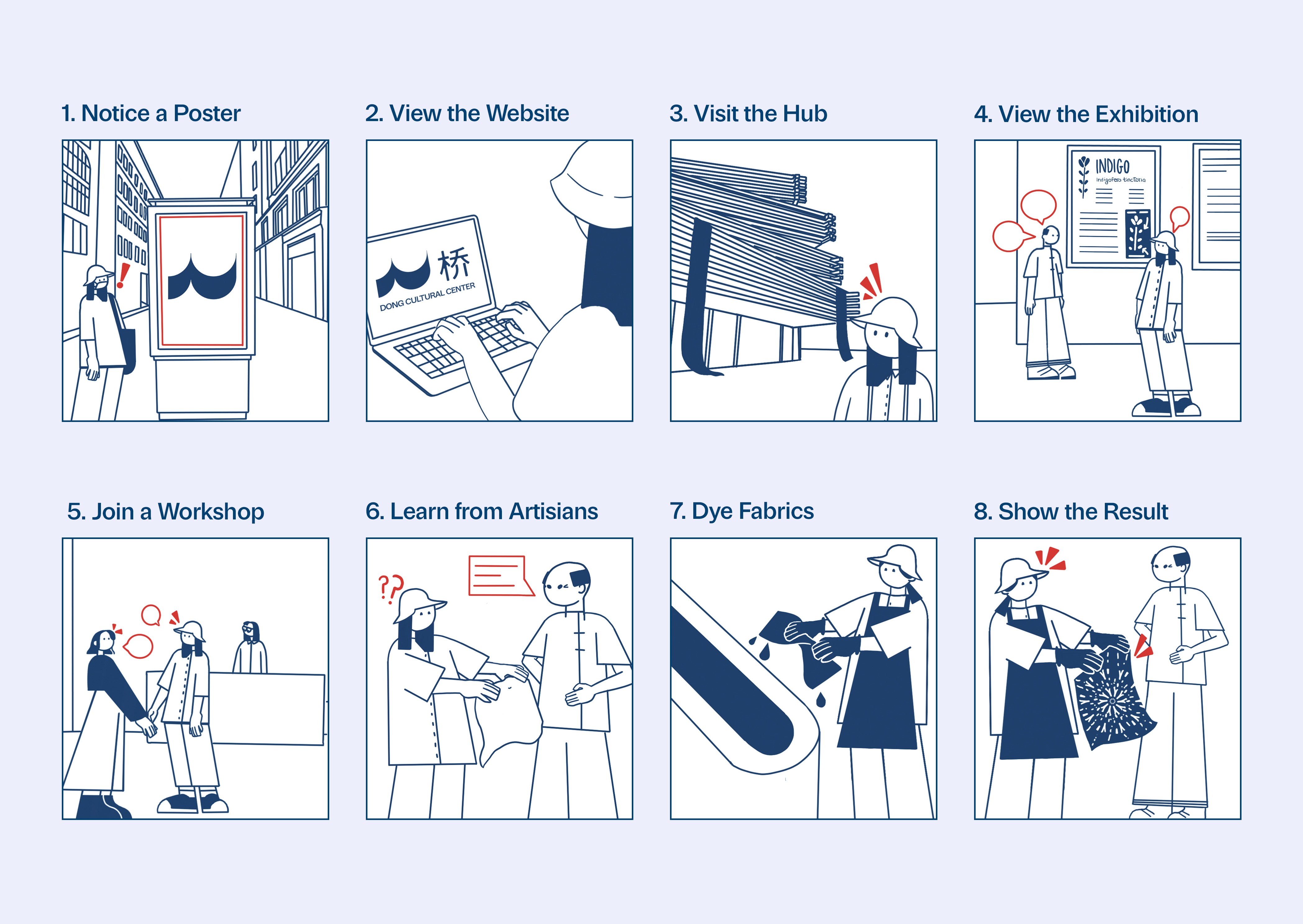 QIAO delivers an integrated service that connects traditional indigo artisans from Dali with citizens in Guiyang through cultural exchange and co-creation. The system combines physical and digital touchpoints, from workshops and exhibitions to an online platform, to make craft heritage accessible and relevant to modern urban life.