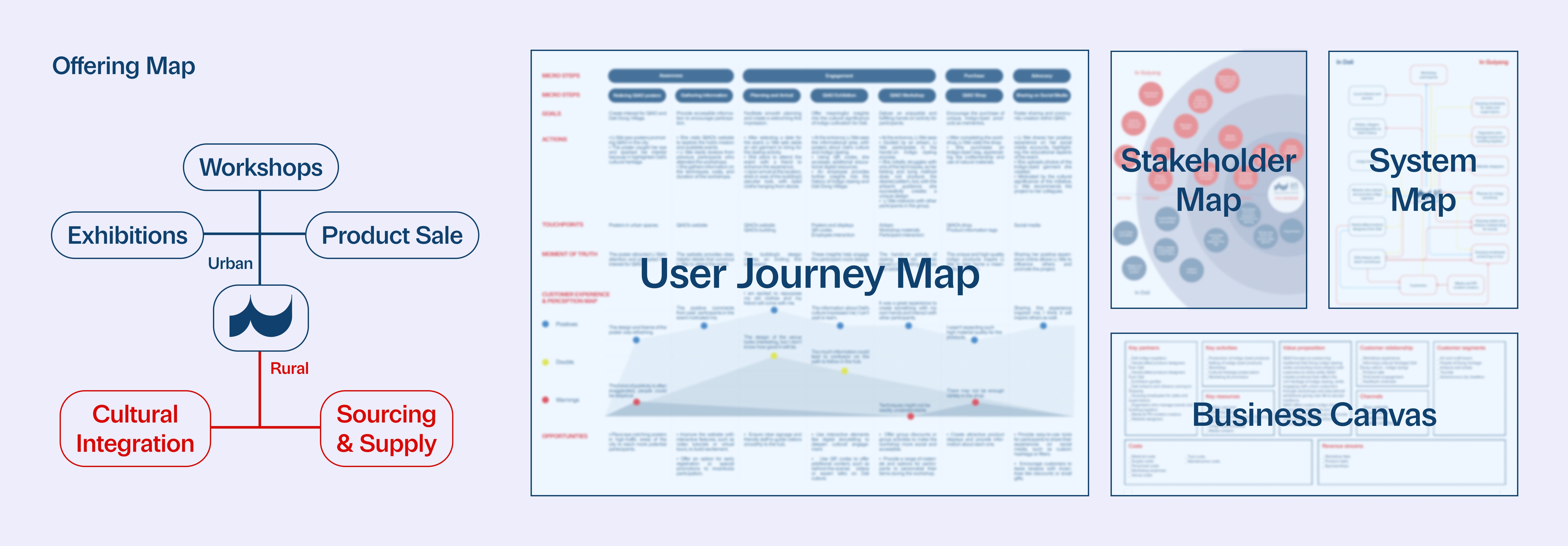Developed key service-design deliverables to structure interactions across QIAO’s services, a user journey map to define experiences, a stakeholder map to clarify relationships, a system map to trace material, financial, and information flows, and a business canvas to align value and feasibility. The simplified offering map highlights the core experiences at the cultural hub and their connection to rural production and sourcing in Dali.