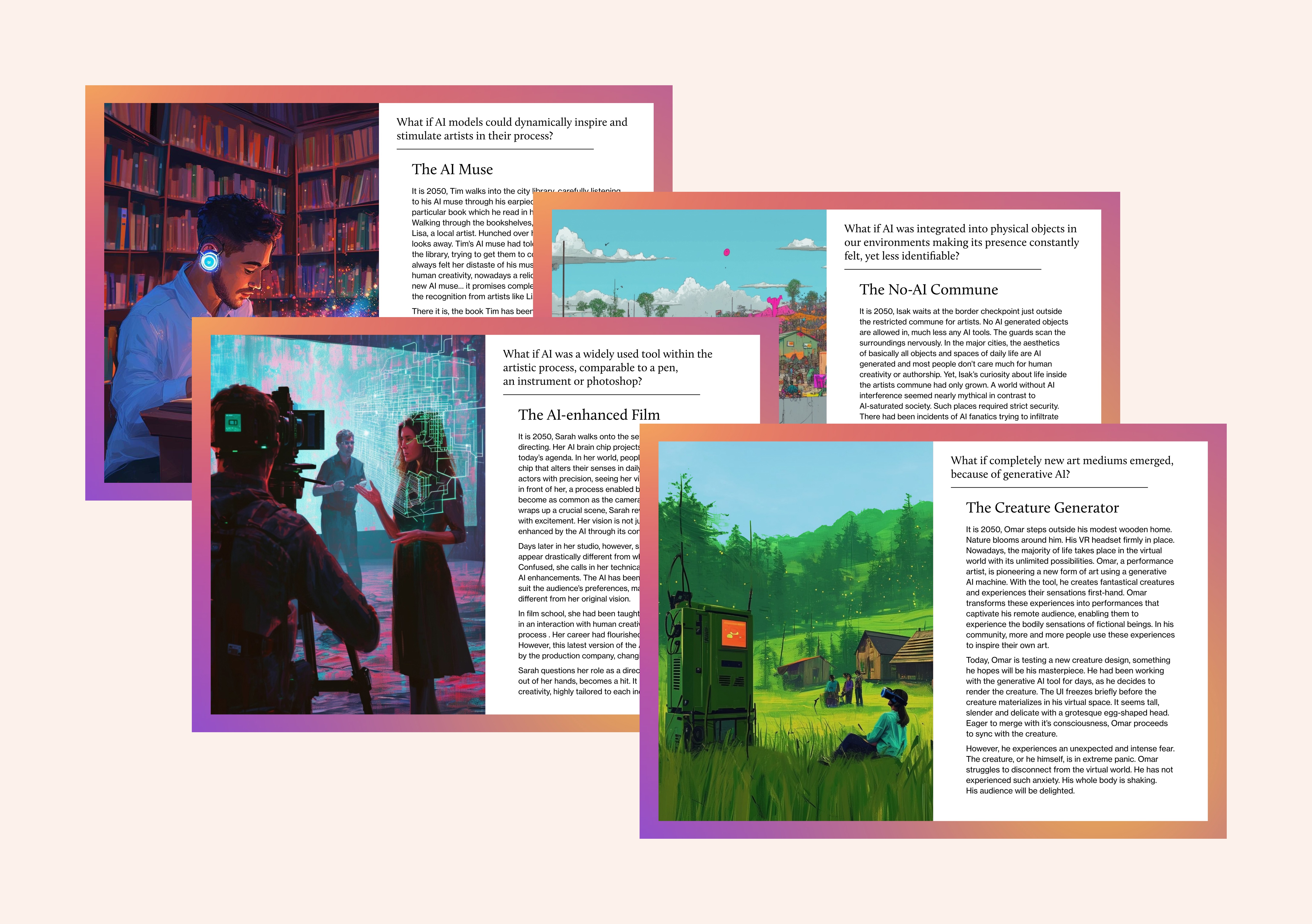 This thesis project applied Speculative and Participatory Design to critically explore the futures of AI in art. Through field research, interviews, and two co-design workshops with artists at Malmö City Library, the project resulted in a public exhibition of four speculative scenarios and a tangible prototype that explored the relationship between artists and AI. Presented as short stories with AI-generated visuals, the work sparked critical debate on generative AI tools and their implications for creative practice.