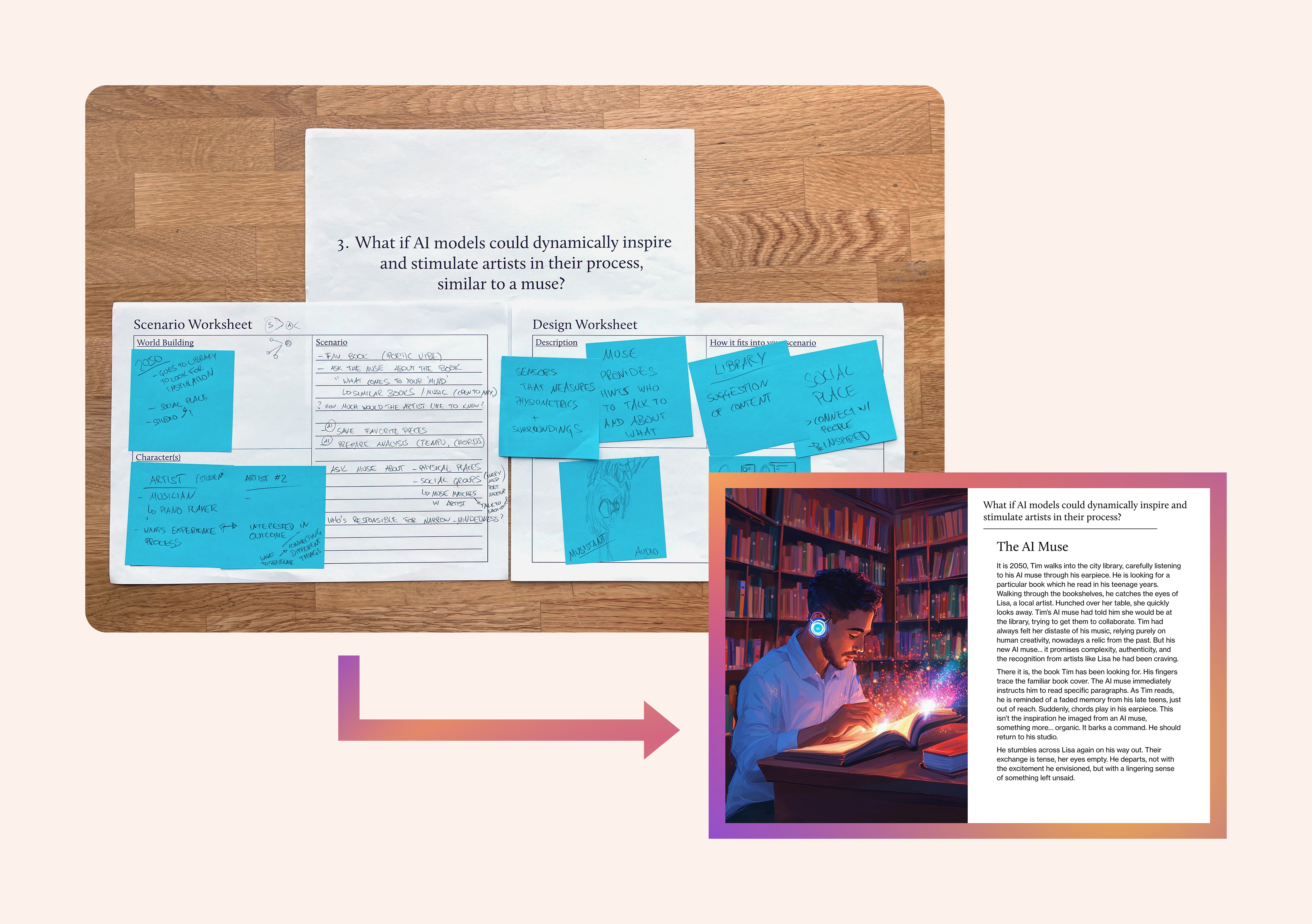Led a second workshop, where Artists transformed their mapped futures into fictional design artefacts and narratives, from intelligent tools to AI-free creative movements. These stories became the foundation for four speculative scenarios that informed the design fiction phase of the project.